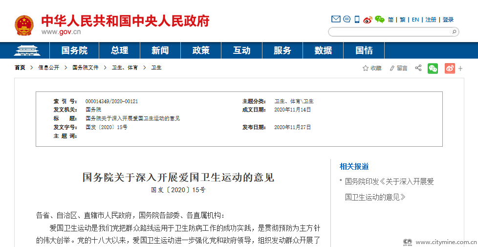 11月14日,国务院印发《关于深入开展爱国卫生运动的意见》(国发〔2020〕15号)。意见指出,新冠肺炎疫情防控暴露出爱国卫生工作在环境卫生长效管理、群众组织动员和健康素养提升等方面仍存在短板。