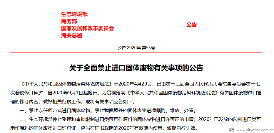 11月24日,生态环境部、商务部、国家发展改革委、海关总署发布《关于全面禁止进口固体废物有关事项的公告》(公告〔2020年〕第53号 )。