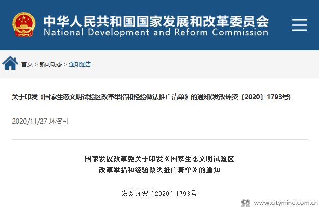 11月25日,国家发展改革委印发《国家生态文明试验区改革举措和经验做法推广清单》(发改环资〔2020〕1793号),供各地区、各有关部门和单位结合实际学习借鉴。